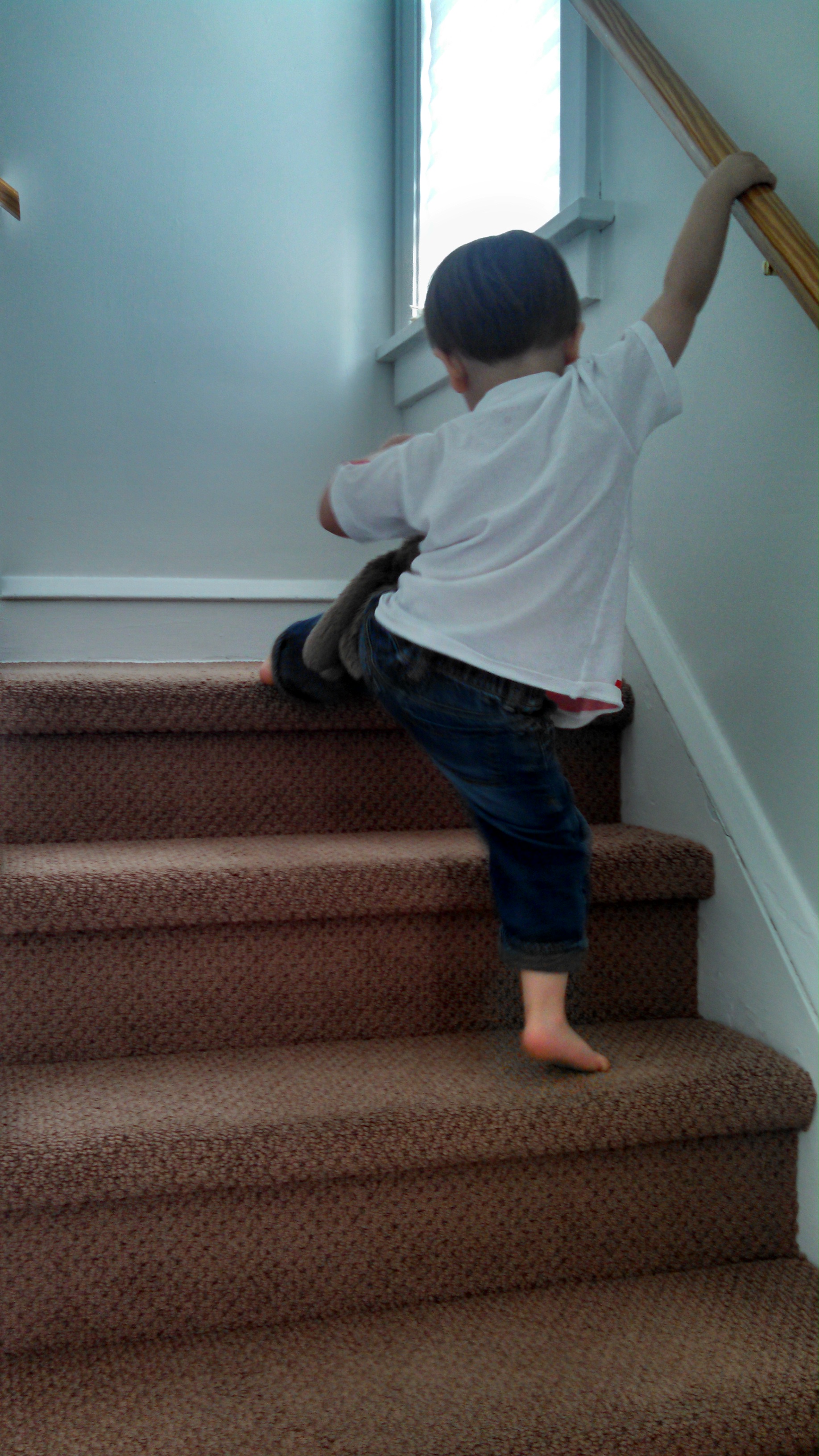 Bounding up the stairs. Trying to bound. Carefully. But still bounding. Yes.